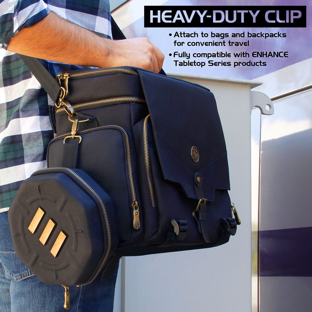 ENHANCE Tabletop Dice Case - Equipped with heavy duty zippers, scratch-resistant lining, and a large soft-lined dice rolling tray with large wall. The ENHANCE Dice Storage Case is the perfect addition to your collection of RPG travel accessories. It is actually two products in one, with one half safely storing up to 150 dice and the other functioning as a large dice tray that can be passed around the gaming table.