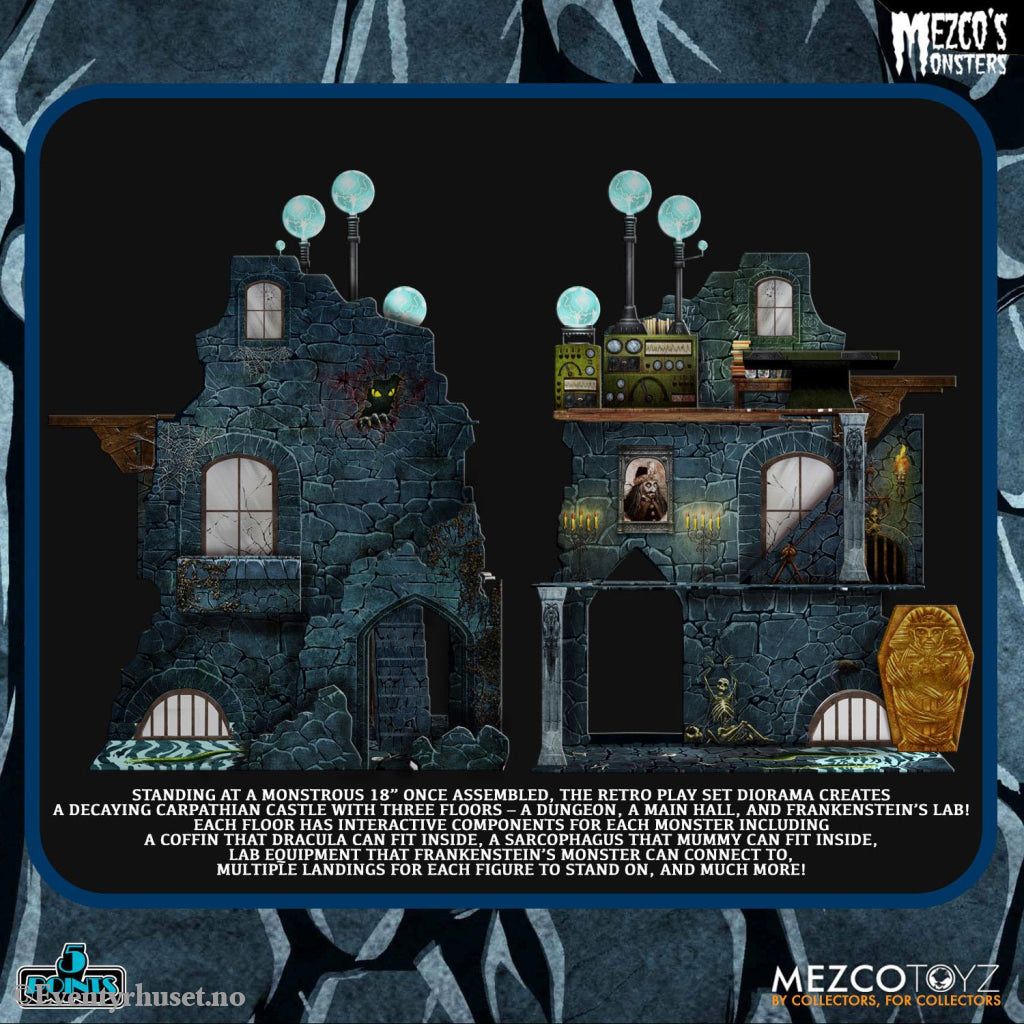 Standing at a monstrous 18" once assembled, the retro play set diorama creates a decaying Carpathian castle with three floors - a dungeon, a main hall, and Frankenstein's Lab! Each floor has interactive components for each Monster including a coffin that Dracula can fit inside, a sarcophagus that Mummy can fit inside, lab equipment that Frankenstein's Monster can connect to, multiple landings for each figure to stand on, and much more!