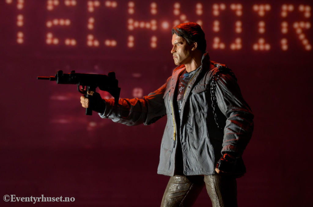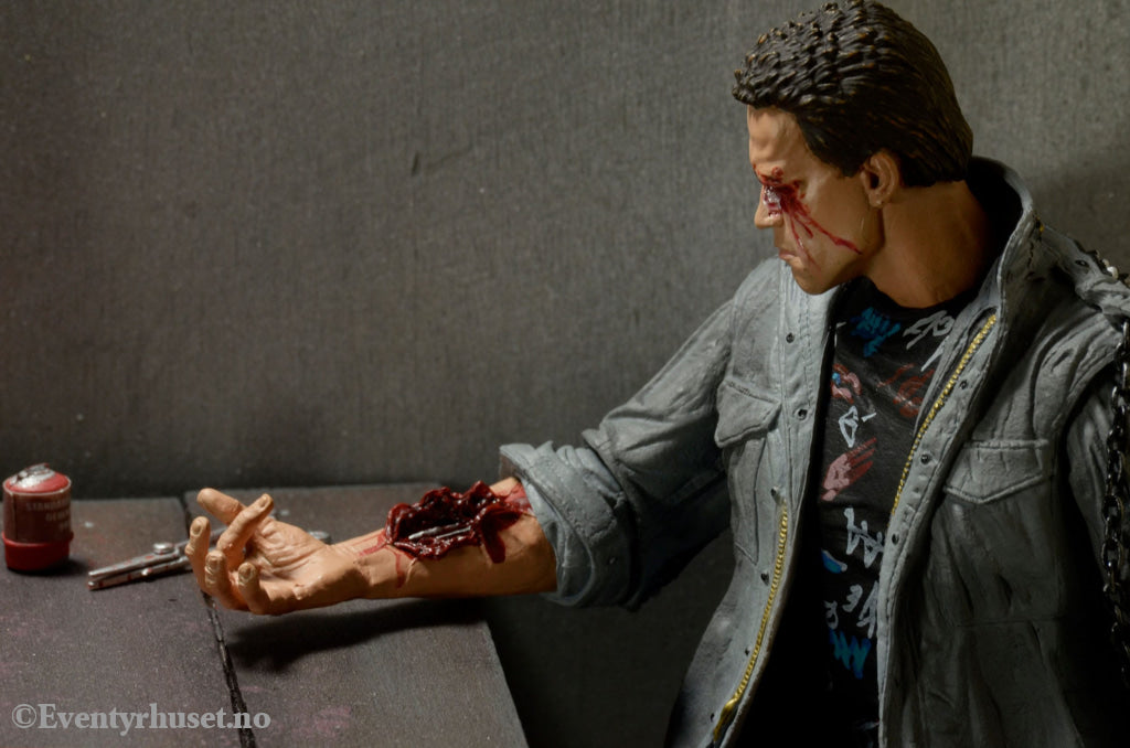 The Ultimate Tech Noir T-800 features that punk outfit with metal jacket chain and bears the likeness of Arnold Schwarzenegger. The deluxe 7" scale figure has over 25 points of articulation, plus 3 interchangeable heads, interchangeable right forearm, alternate hand, a small arsenal of weaponry, and two surgical tools for post-battle repairs.