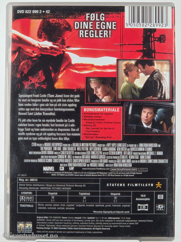 Thomas Jane spiller Marvel-antihelten Frank Castle, en mann som mister alt og blir et hevnens redskap mot mafiaen. En mørk og brutal actionfilm med John Travolta.