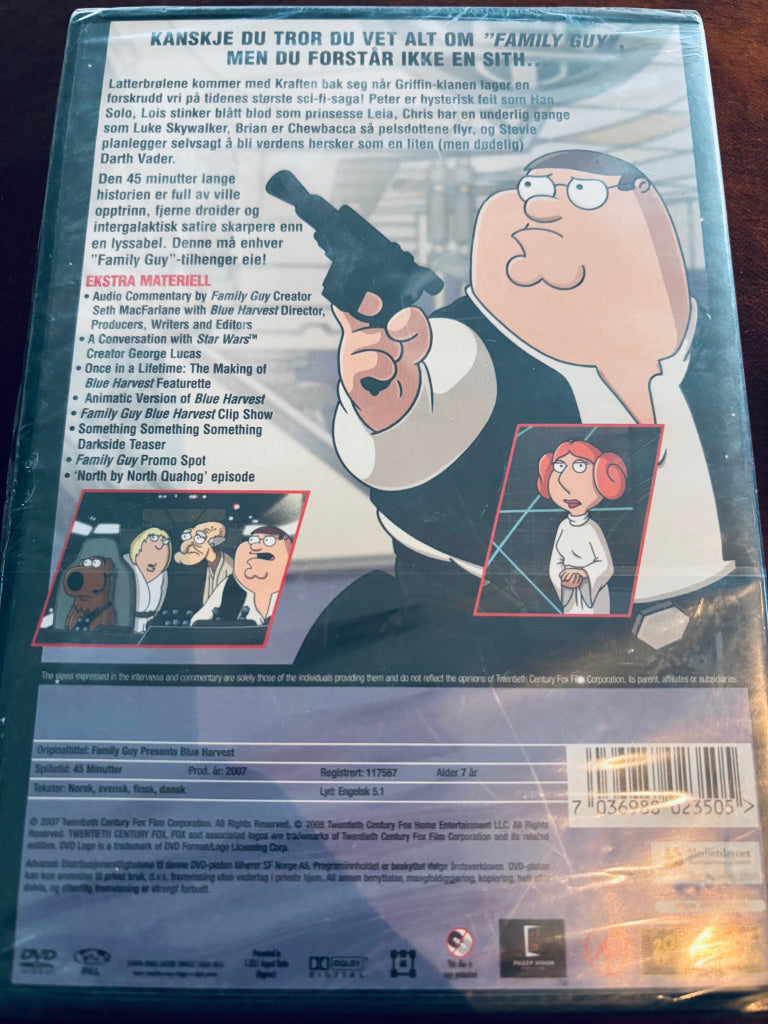 Bli med på en galaktisk reise med Family Guy – Blue Harvest! Denne fantastiske DVD-en er som en skattekiste fylt med latter og eventyr, og nå kan du eie den helt ny i plast!
