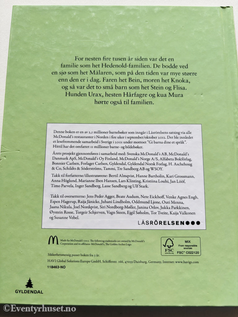 Klassisk svensk barnebok om Hedenoldfamilien som opplever steinalderlivets gleder og utfordringer. Humoristisk og lærerik med ikoniske illustrasjoner.