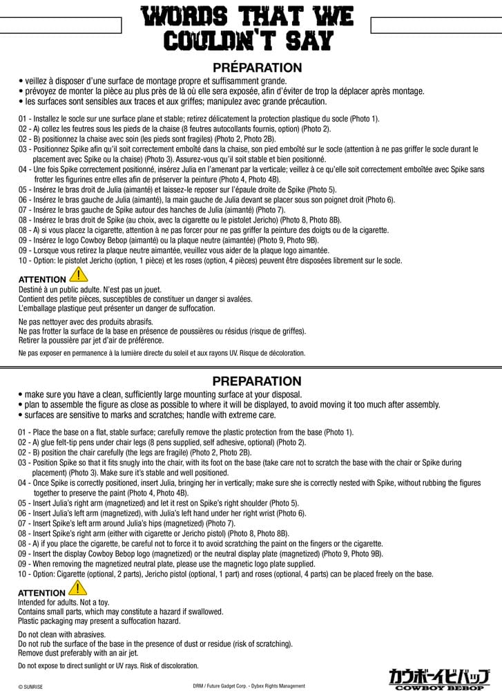 The Future Gadget Corporation team has worked intensively, with all its passion, to reproduce one of the serie's most poignant artworks of the two lovers. Spike, in his ealier years, displays the "evil" design of his mafia days, while Julia wears her distinctive black suit. Her golden hair flowing down gracefully to the hips.