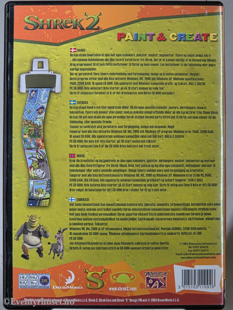 Et kreativt aktivitetsprogram for barn hvor man kan fargelegge, lage og skrive ut Shrek-bilder og scener fra filmen. Utgitt med norsk tekst og manual.