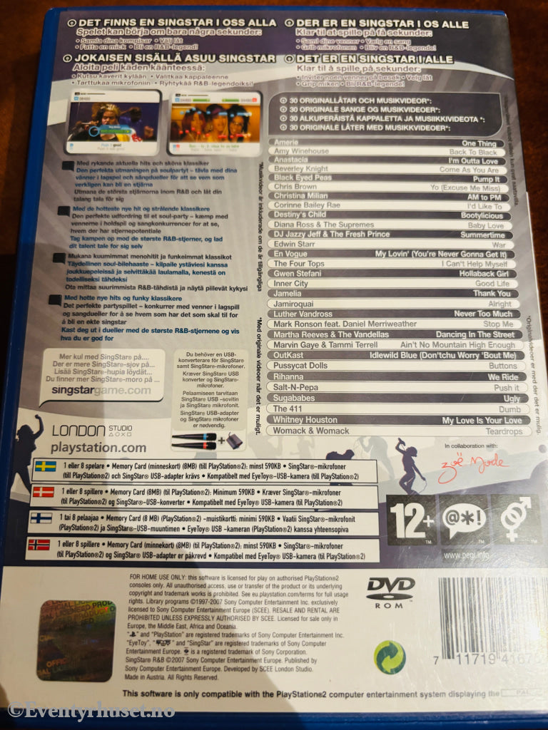 Med Singstar R&B til PS2 tar du med deg feststemningen rett hjem! Forbered deg på å synge med på de mest fengende R&B-låtene og bli stjernen i ditt eget show. Delta i dueller med venner eller syng solo og finn din indre artist. Dette sprudlende spillet gir deg muligheten til å dele musikkopplevelsene og skape minner som varer. Gjør klar mikrofonen og la kveldens underholdning begynne!