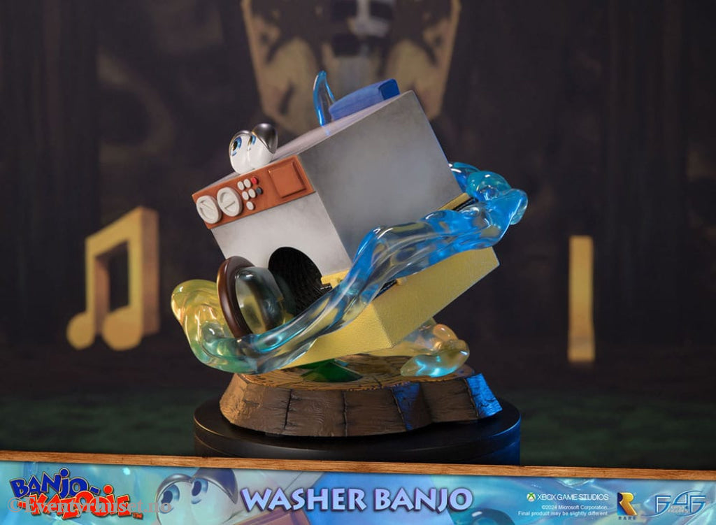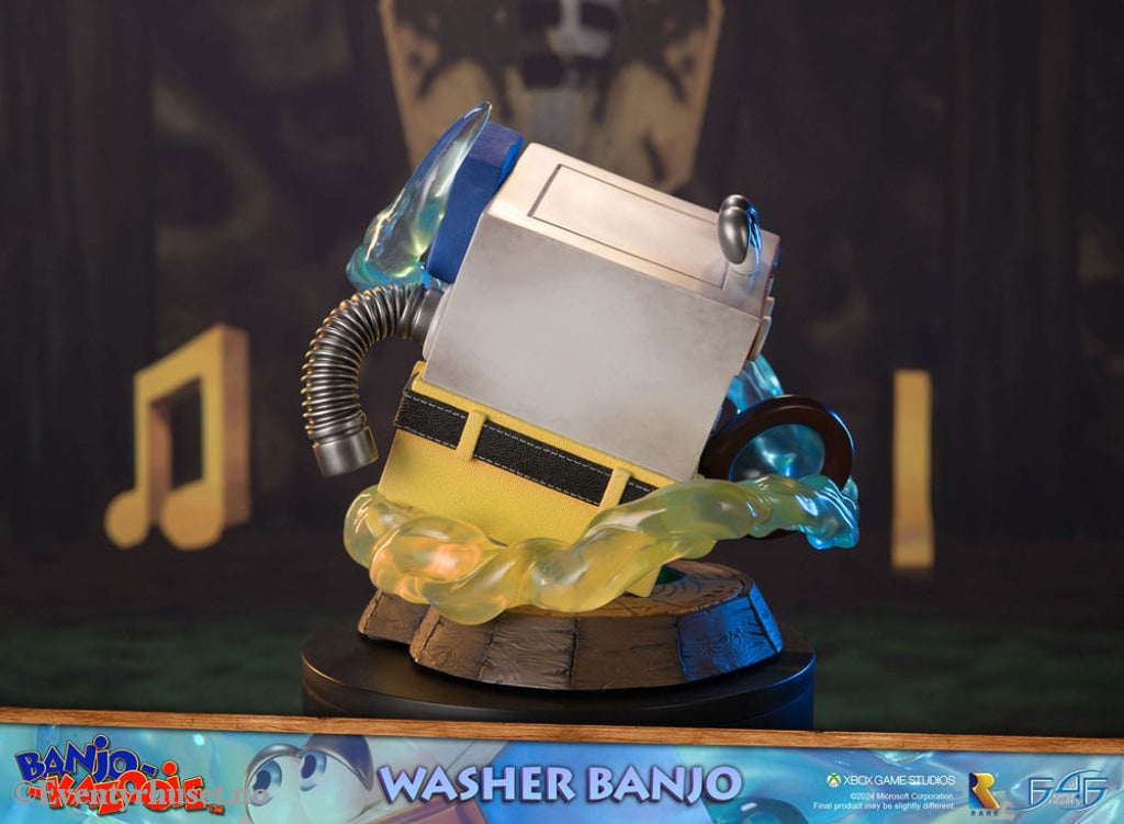 First 4 Figures proudly presents their latest resin collectible, Washer Banjo! This is the sixth "transformation" statue to release in the Banjo-Kazooie lineup. One of the many transformations Banjo and Kazooie undergo in the original game is turning into a washing machine as a joke. The Washer Banjo transformation is a comedic moment during Mumbo Jumbo's spell, turning the duo into a washing machine with a playful request to clean his loincloth, swiftly followed by the correct transformation. However, completing all of Bottles' Bonus Challenges unlocks a cheat code, allowing gameplay as Washer Banjo. The base of Washer Banjo replicates the skull plinth that Banjo steps on for Mumbo to perform his transformation magic on the duo.