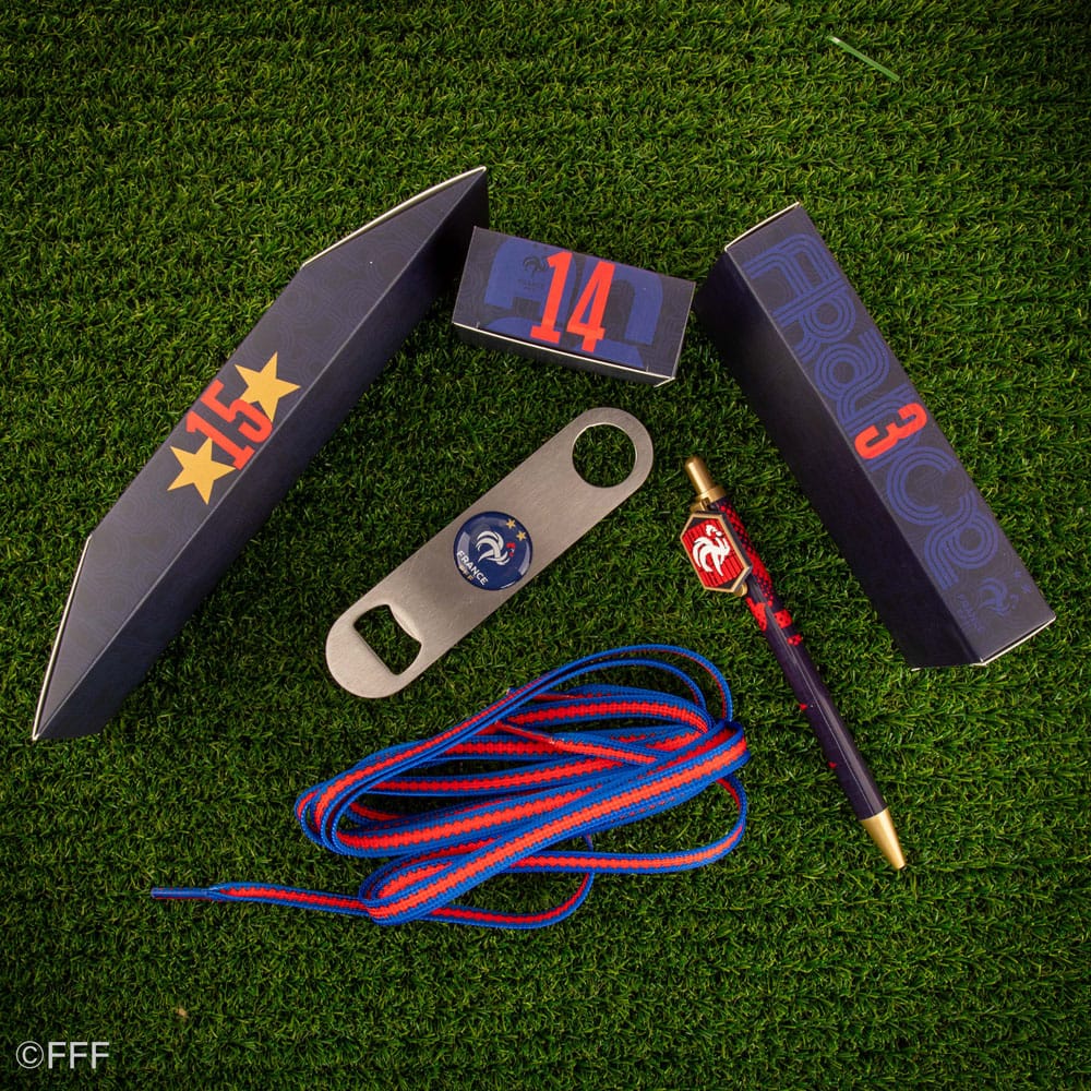 Officially licensed advent calendar with 24 French Football Federation themed gift items (Eraser, drawstring bag, captain band, acrylic stand, luggage tag, glass pouch, washi tape, socks, pen with pin, bucket hat, 3d keychain, microfiber cloth, lenticular pin badge, pop socket, lenticular sticker, pin, socks, headband, shoe bag, phone ring, foam magnet, lock, bottle opener, shoe lace)