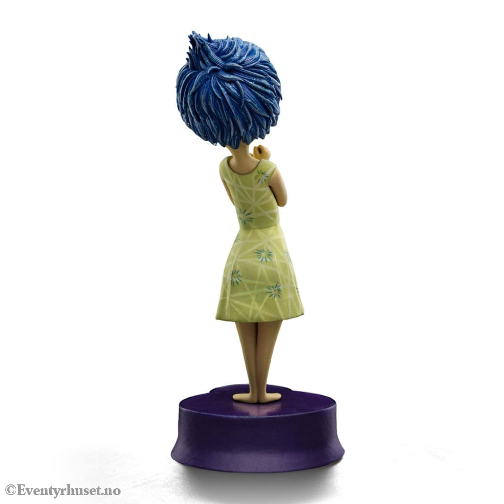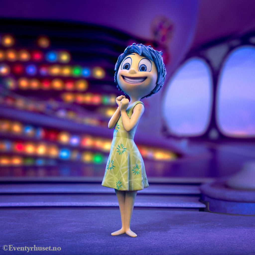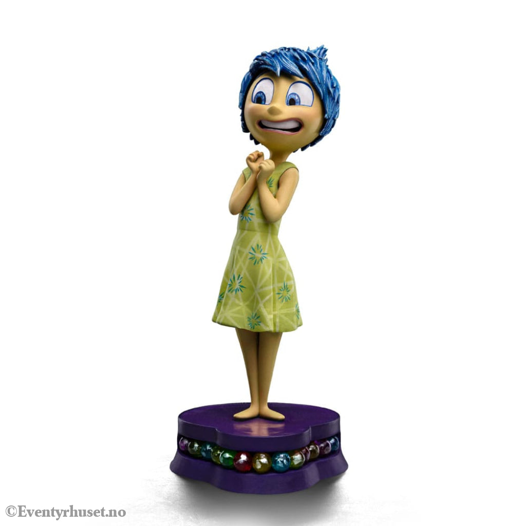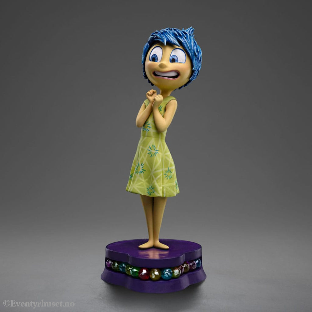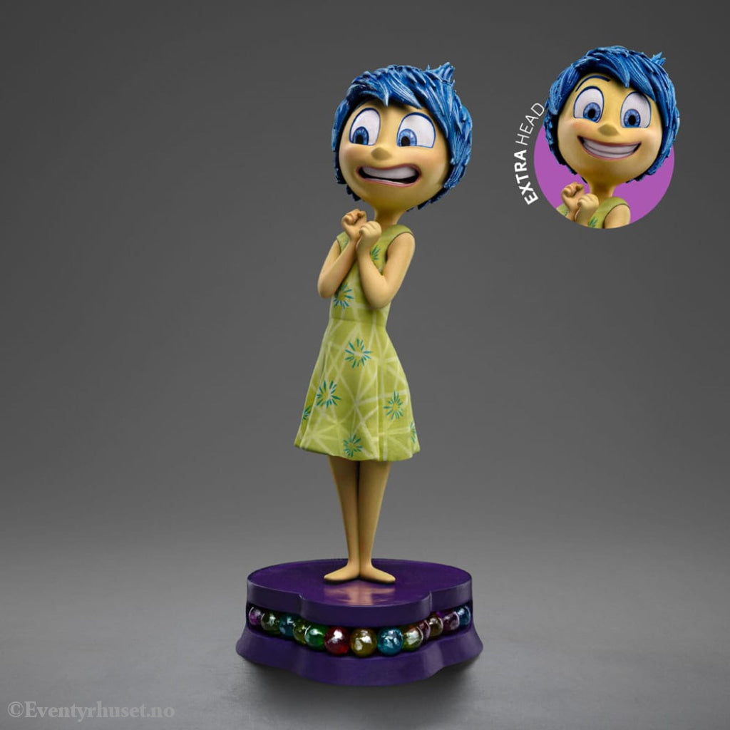 One of the first emotions to appear in the mind of the girl Riley Andersen, with the objective of ensuring she is always happy, optimistic, and determined in all situations, expresses distrust and apprehension with a forced smile upon meeting the representative of a new feeling. The protagonist of Disney-Pixar's Inside Out franchise, the slender personification of one of the main emotions, with light yellow skin, blue hair and eyes, and perfectly aligned white teeth, is inspired by a star, symbolizing her trademark emotion of happiness. Wearing a short-sleeved green-and-yellow patterned dress, Iron Studios presents the statue ""Joy - Inside Out 2 - Art Scale 1/10,"" featuring an extra interchangeable head that reflects her name with a smile, set on a base that emulates the control center floor in Riley's mind, with colorful glass spheres known as Memory Orbs displayed in the front. Joy always strives to keep the girl happy.