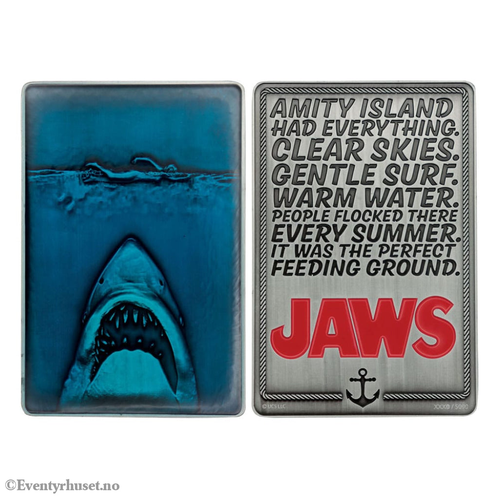 "Depicting one of the most famous movie posters ever to exist, this limited edition Jaws ingot shows off Roger Kastel's iconic design on the front with encapsulated resin, and on the reverse features the movie's tagline and logo.