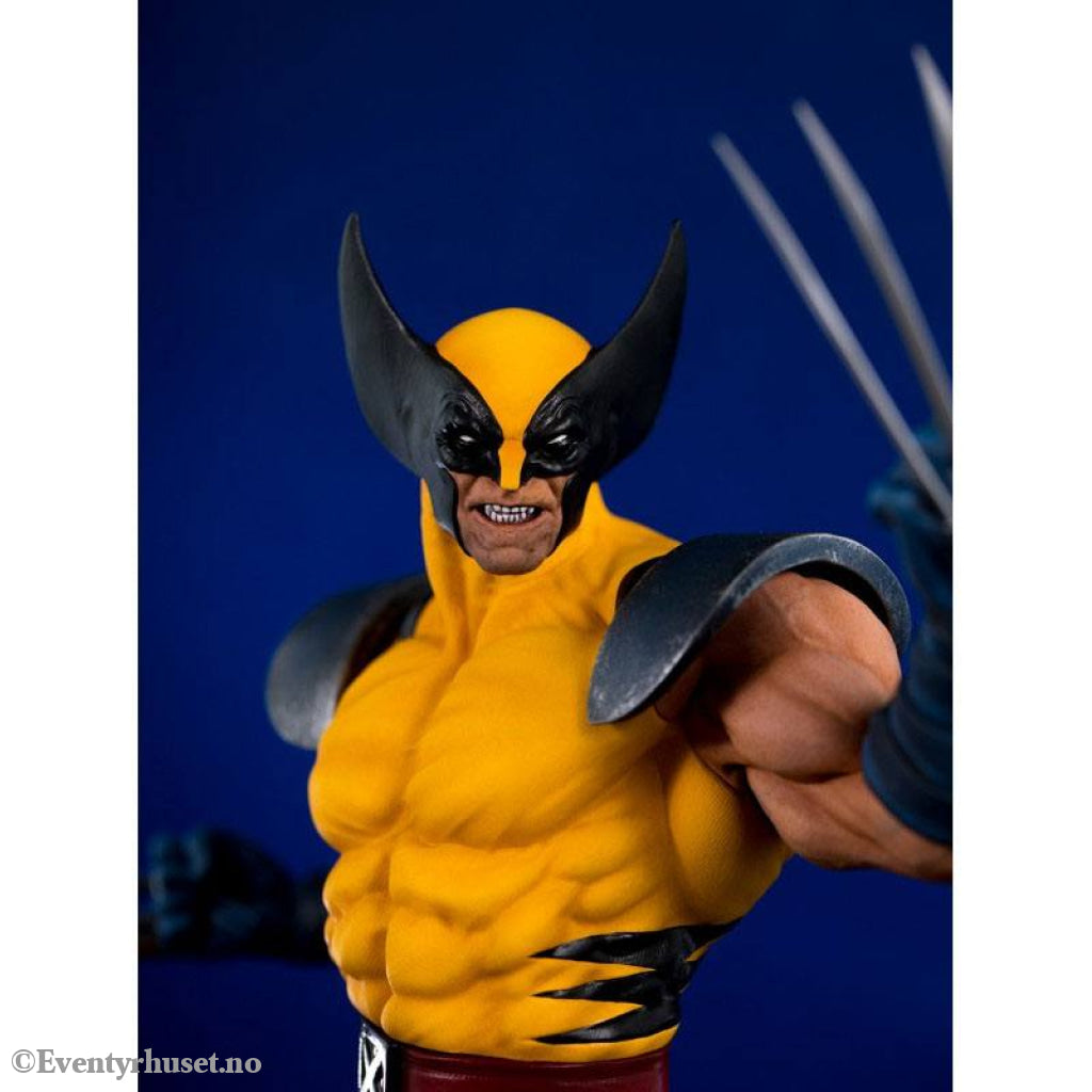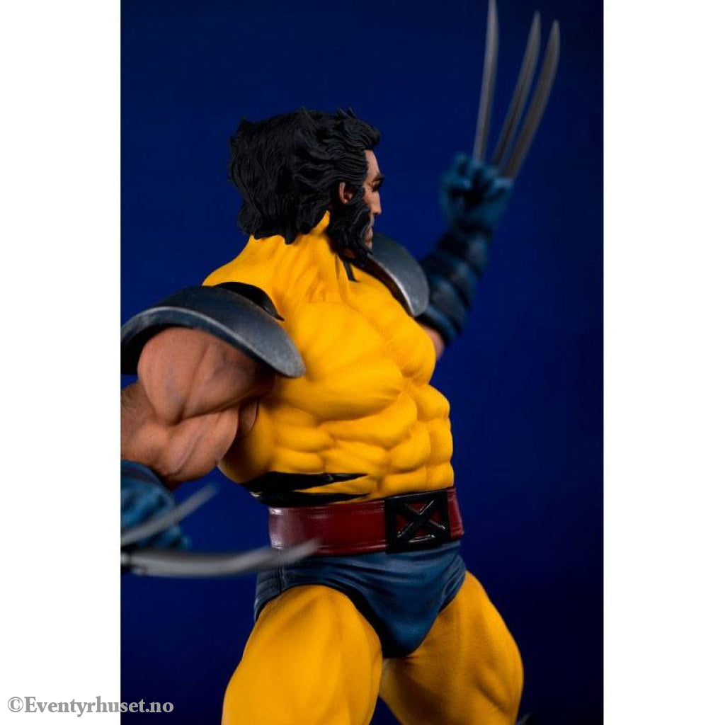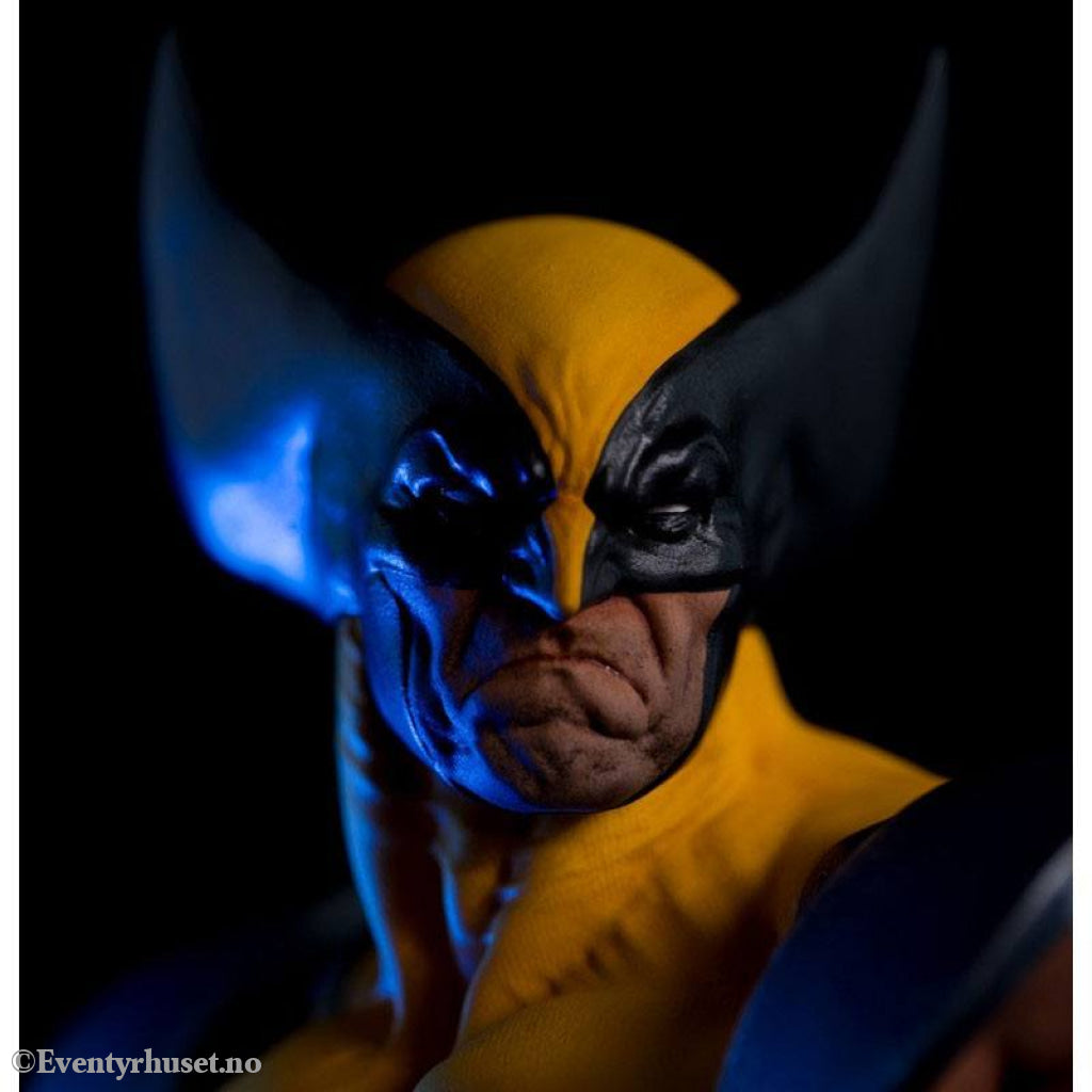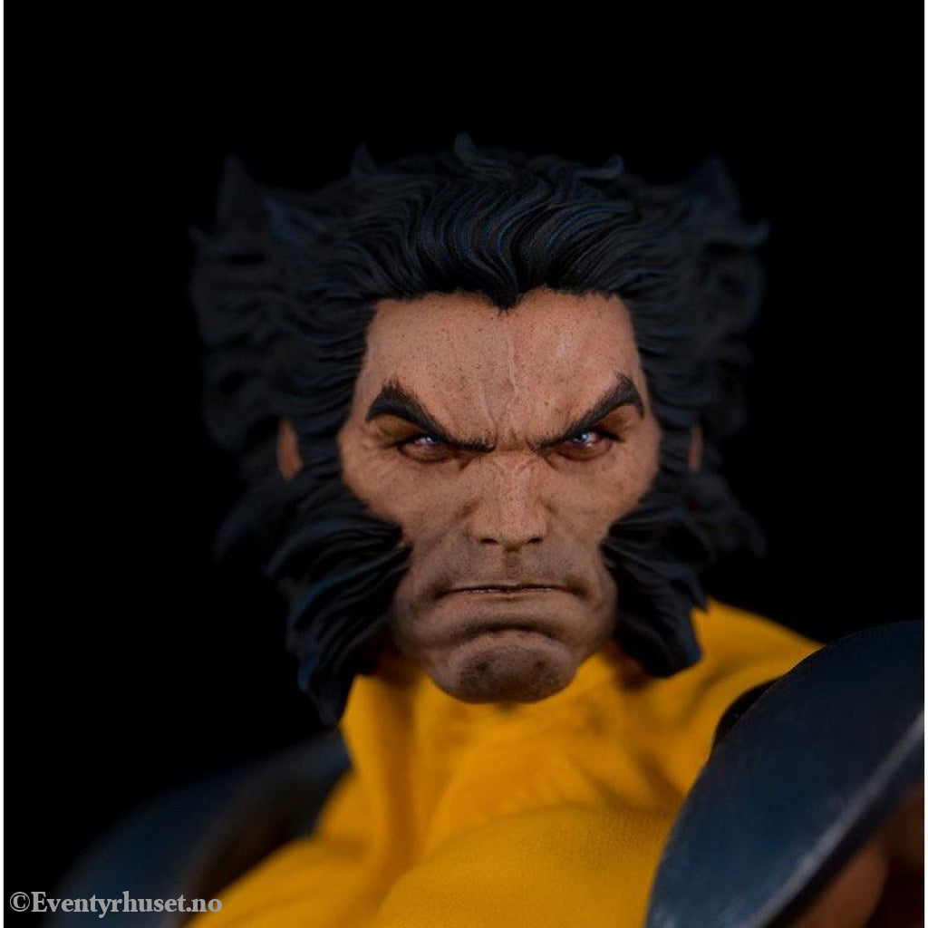 The gold and blue costume of Marvel's mutants most glorious era shines on the shoulders of our Canadian berseker, complete with the X-Men insignia belt buckle and weathering from past battles.