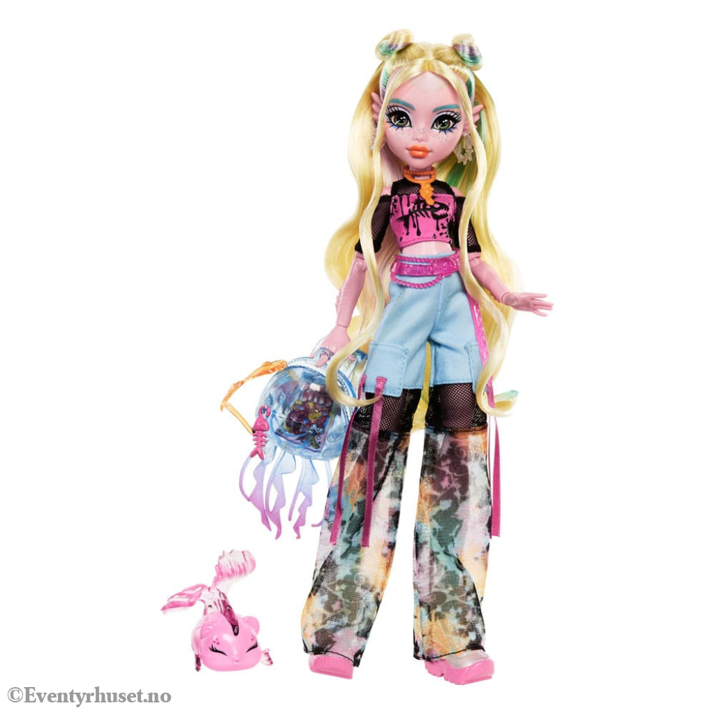 This Monster High doll makes quite a fintastic sea monster! Lagoona Blue drips unbe-reef-ably cool style in her Y2K-inspired lurk. Her bubbly piranha Neptuna looks as spooky-sweet as ever, too! With her poseable body and ocean-inspired storytelling accessories, Lagoona Blue doll is an eek-ceptional gift for kids 4 years old and up. Fully articulated. Doll cannot stand alone. Colors and decorations may vary.