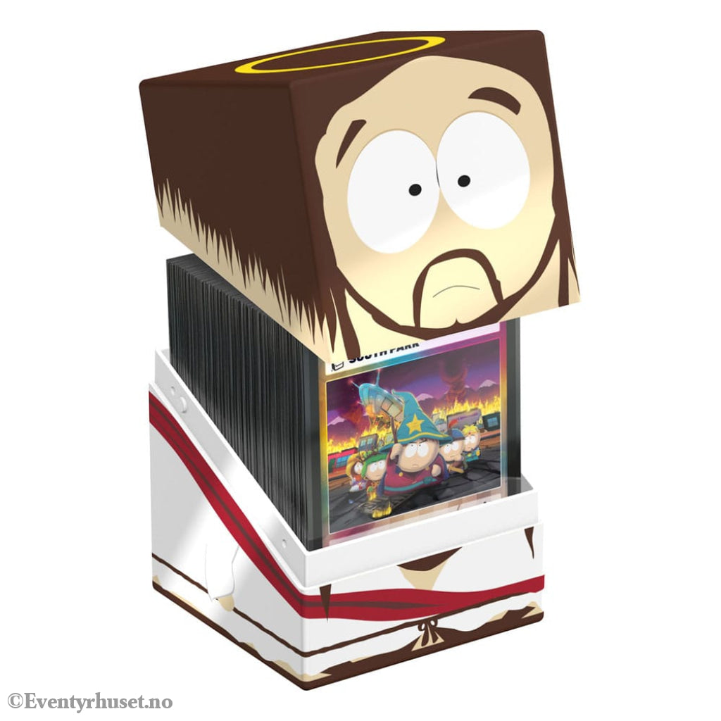 Collectible box for storing TCG decks, tabletop gaming accessories, and/or collectibles. The Jesus Squaroe from the South Park edition holds up to 100 cards in double protective sleeves if used as a deck box. Squaroes are made from 78% renewable resources and fit perfectly into the separately available Collectors Case.