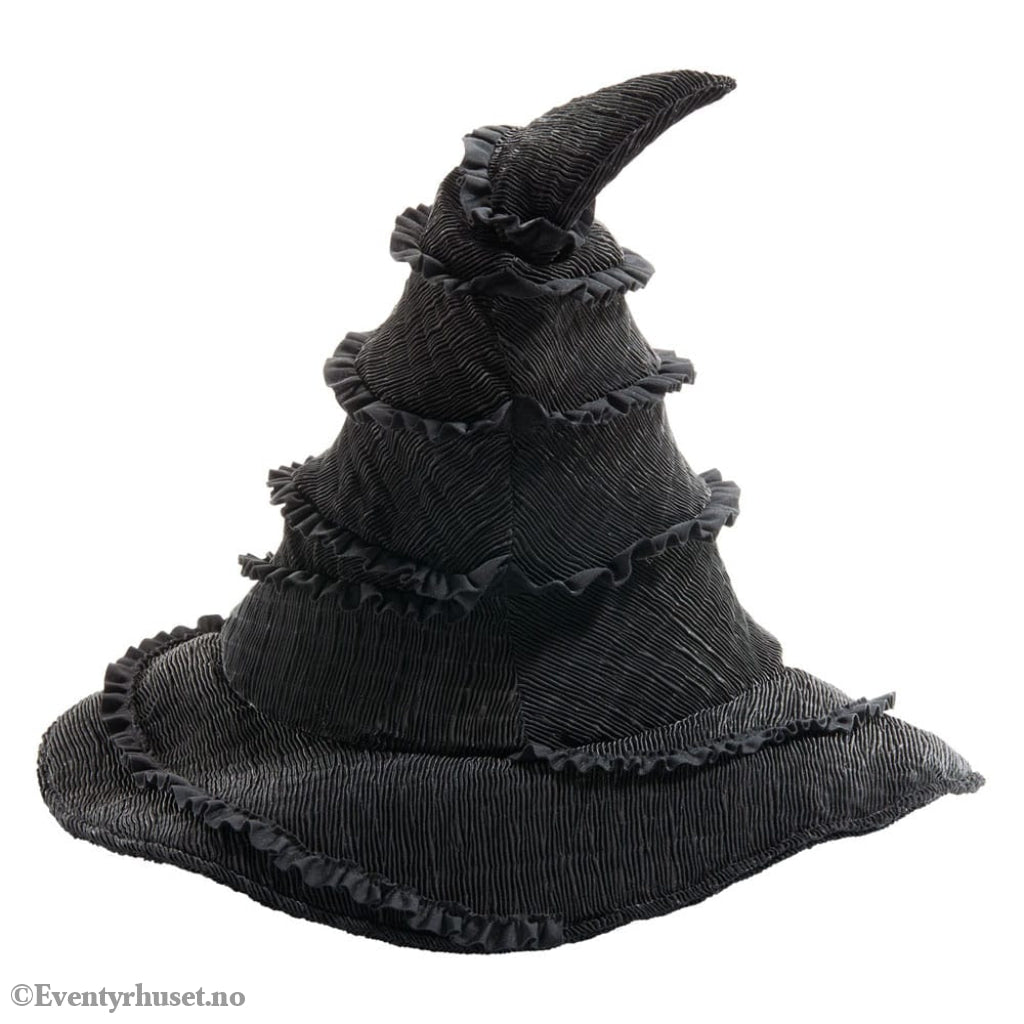 This adult-sized replica hat measures approx. 15" tall with an approx. 14" brim, and features intricately textured fabric, collapsible tiers, and ruffles along each pleat in the fabric.